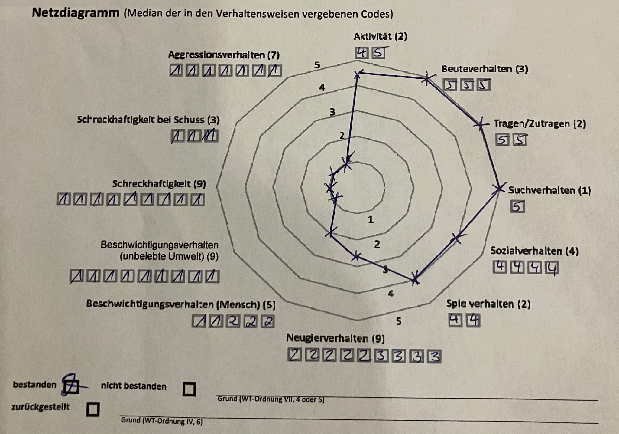 | „Die 18 Mon. alte Hündin bewegt sich mit hoher Aktivität durch die belebte und unbelebte Umwelt. Der gesamte Beutekomplex wird ausdauernd und freudig gezeigt. Fremden Menschen gegenüber ist sie freundlich und offen.“ | Netzdiagramm |